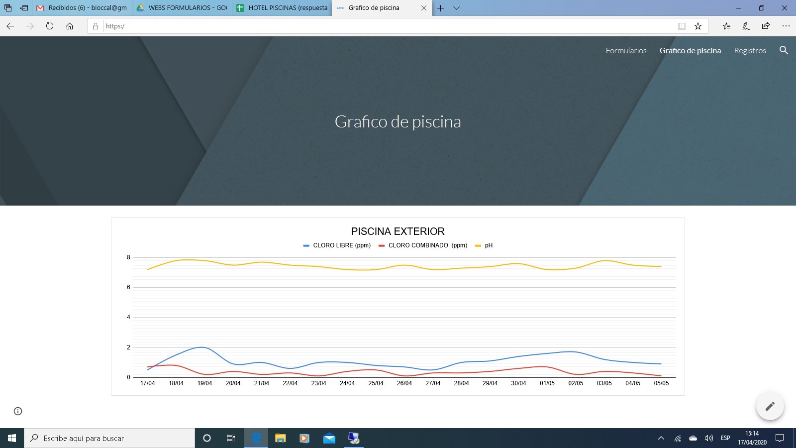 Como los datos se van almacenando en el sistema, se hacen graficas de los parámetros analizados, Desinfectante, pH.. de cada piscina para ver la evolución a lo largo del tiempo y poder ser archivados .